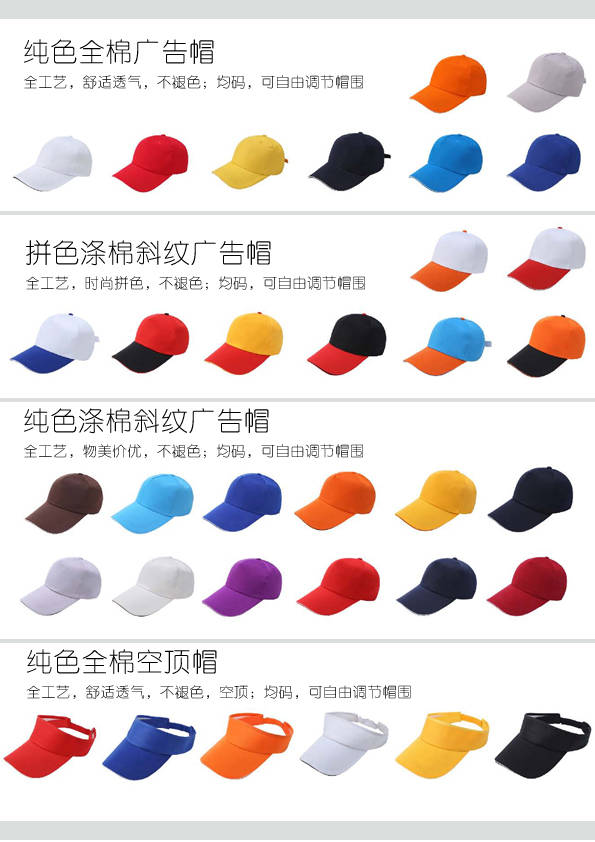 廣告帽作為一種現代新穎廣告載體,具有流動性大、色彩鮮艷和良好的視覺效果,其圖案設計不受限制、結構可任意選擇以及美觀耐用、質優價惠等多種優點,成為企業廣告宣傳的一種重要形式,廣告帽具有其它形式廣告不可比擬的優勢。廣告帽優勢:1﹑流動性大:廣告帽具有走到哪里,廣告就做到哪里的優點;2﹑物美價廉:廣告帽具有廣告投入成本低,制造過程快,消費者印象深等優點;3﹑實際用途廣:廣告帽具有陰天遮風,晴天遮陽的功能,是男女老少不可少的一種日常生活用品;4﹑廣告時間長:廣告帽的使用壽命長,可對企業進行長期的廣告宣傳,是一種可靠的廣告方式。廣告帽訂制,可以把您的創意,圖案印制到帽面上,可印前面、后面、側面,圖像逼真清晰,是佳節慶典、廣告促銷之最佳禮品。