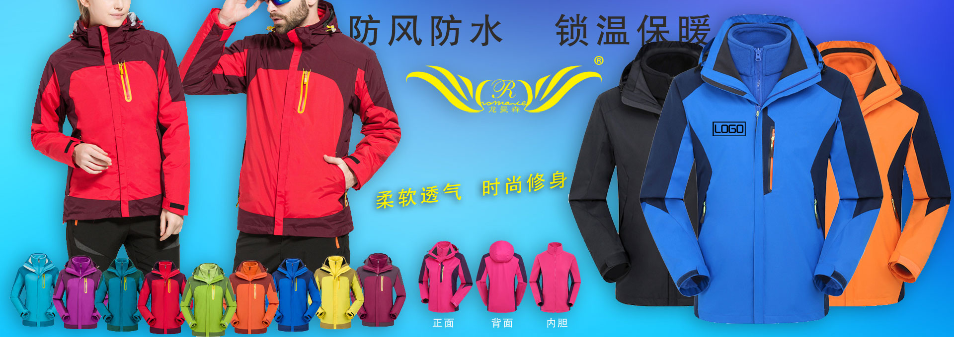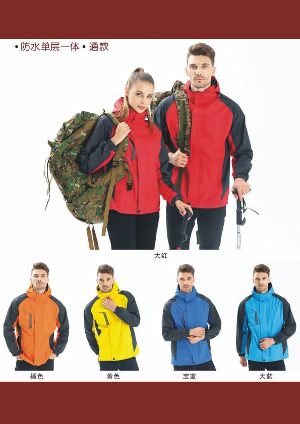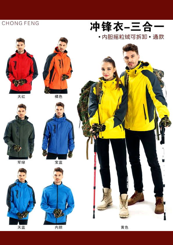 沖鋒衣,外文名Jackets,又名Outdoor Jackets,音譯為夾克,戶外運動必備裝備之一。沖鋒衣之所以能成為所有戶外愛好者的首選外衣,是由其全天候的功能決定的。沖鋒衣的 英語為“Jackets”或者“Outdoor Jackets”,直譯過來就是“夾克”,沖鋒衣并不神秘,就是夾克衫,但由于這種功能性服飾從國外傳到中國時,國人為了和普通衣服區別開來,就從其“意譯”上入手,叫做“沖鋒衣”。越來越多的企業把這一種服裝當做職業服裝來使用,比如經常在戶外工作的人們。在服裝的后背或前胸印繡上本企業的LOGO或標識這樣就具備了宣傳及展示企業形象的效果。